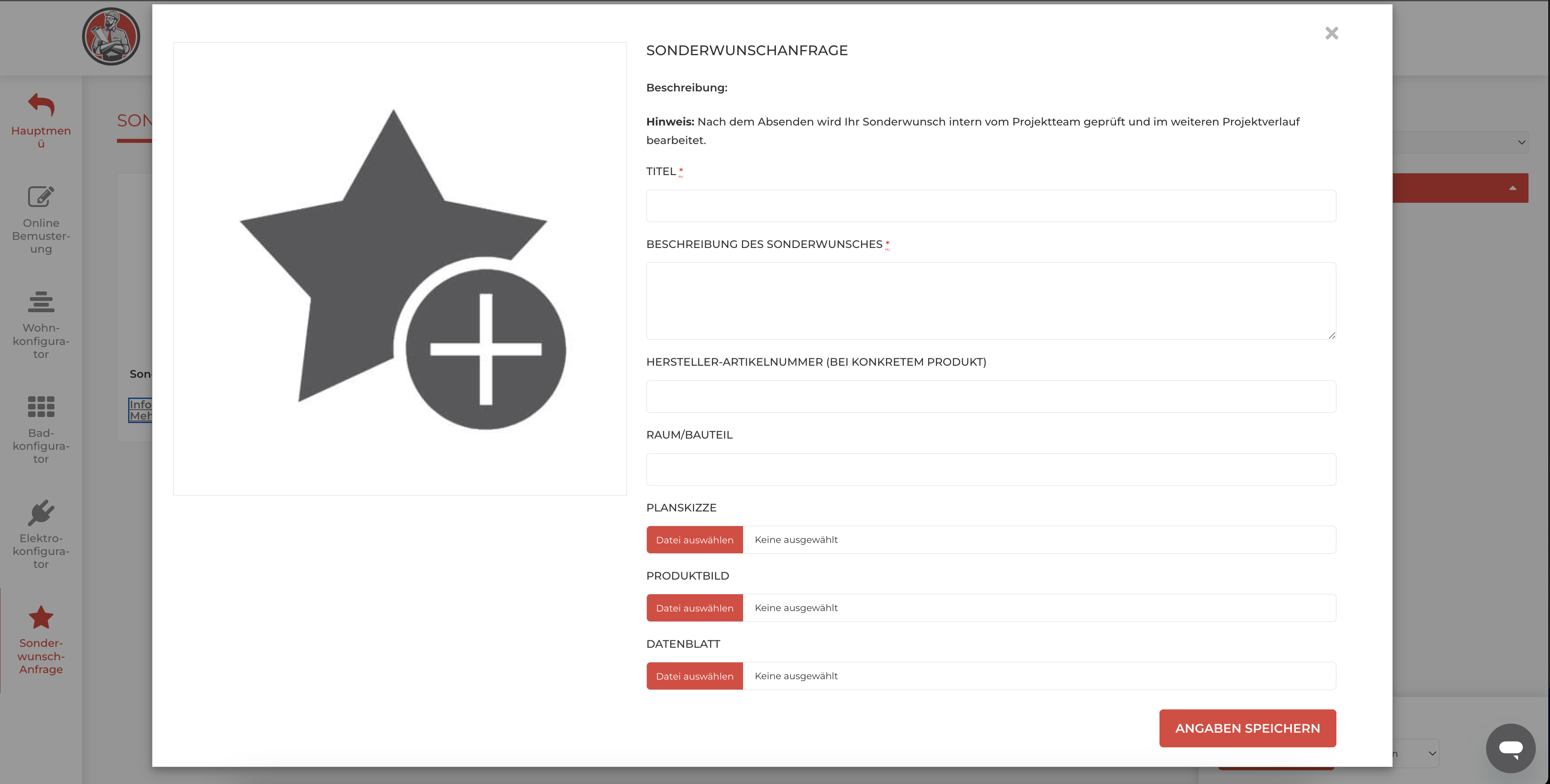 Das Sonderwunschanfrageprodukt dient der strukturierten Erfassung von individuellen Kundenanforderungen, die nicht über bestehende Konfiguratoren oder Standard-Bemusterungen abgedeckt werden können.