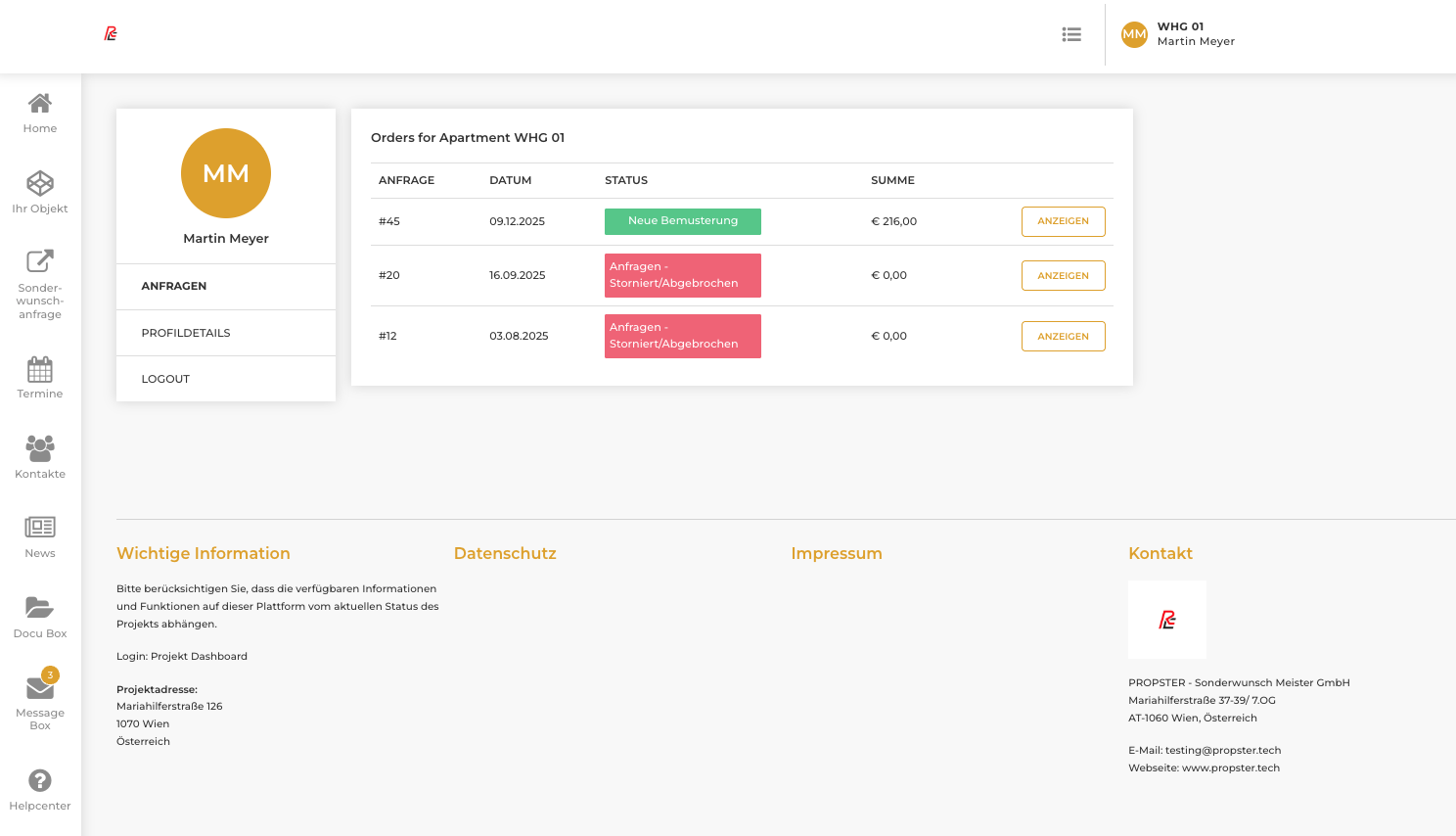 Alle Benutzer mit der Rolle Customer, denen ein Objekt zugewiesen ist, haben Zugriff auf die Statusübersicht ihrer Anfragen, Bemusterungen und Mangelmeldungen.