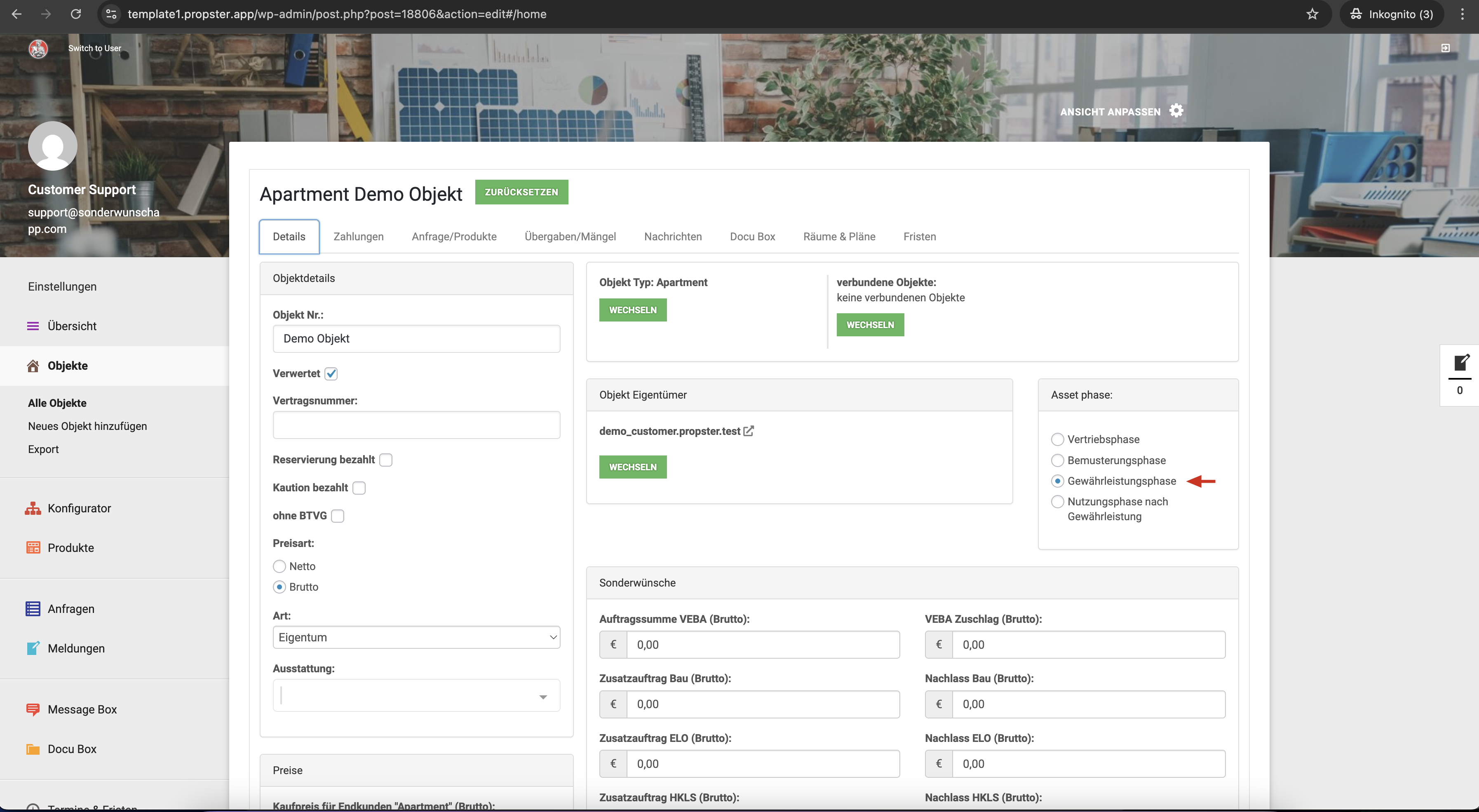 In der Bearbeitungsmaske wählen Sie die Objektphase „Gewährleistung“