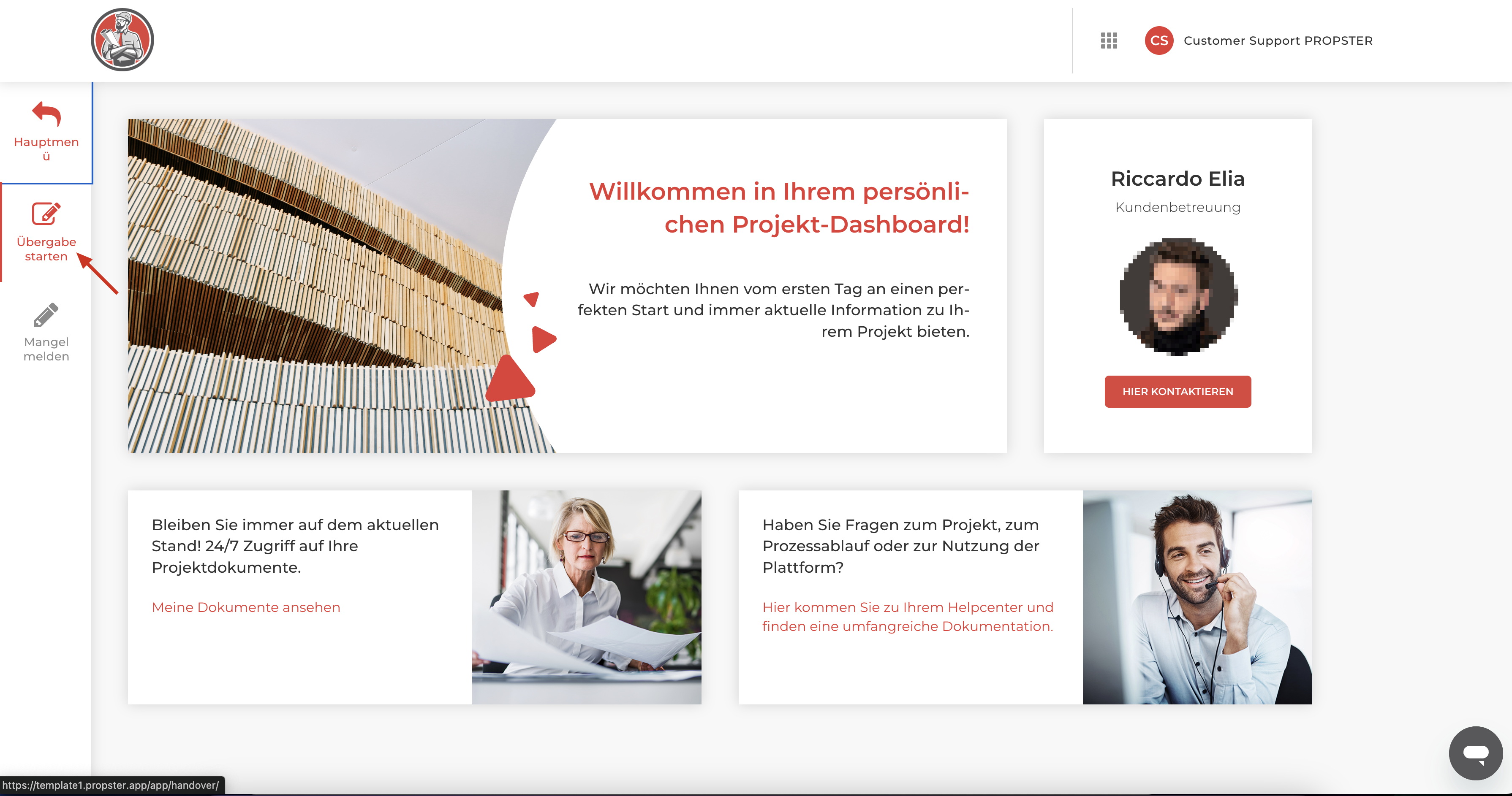 Der Übergabeprozess wird im Frontend der Kundenplattform gestartet