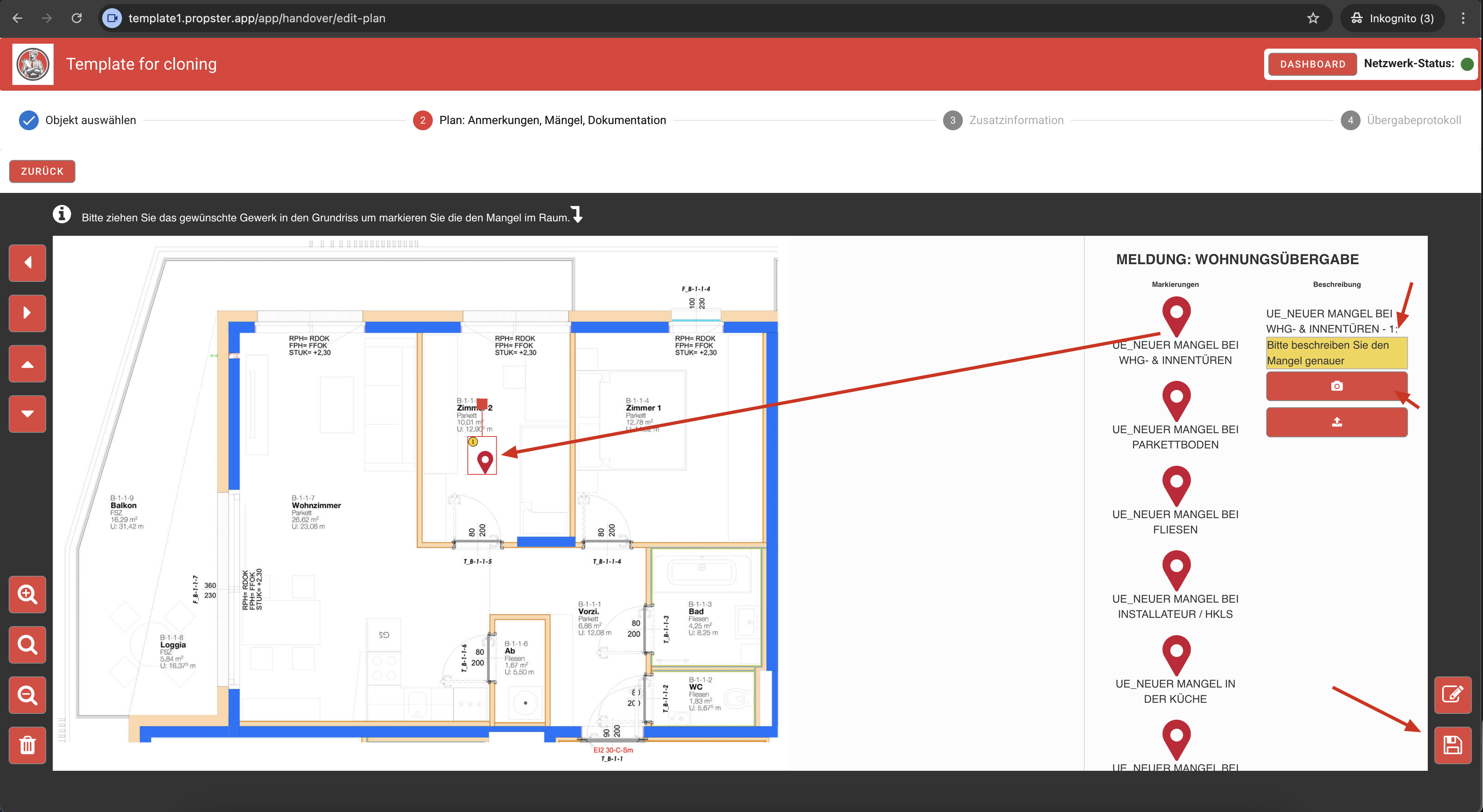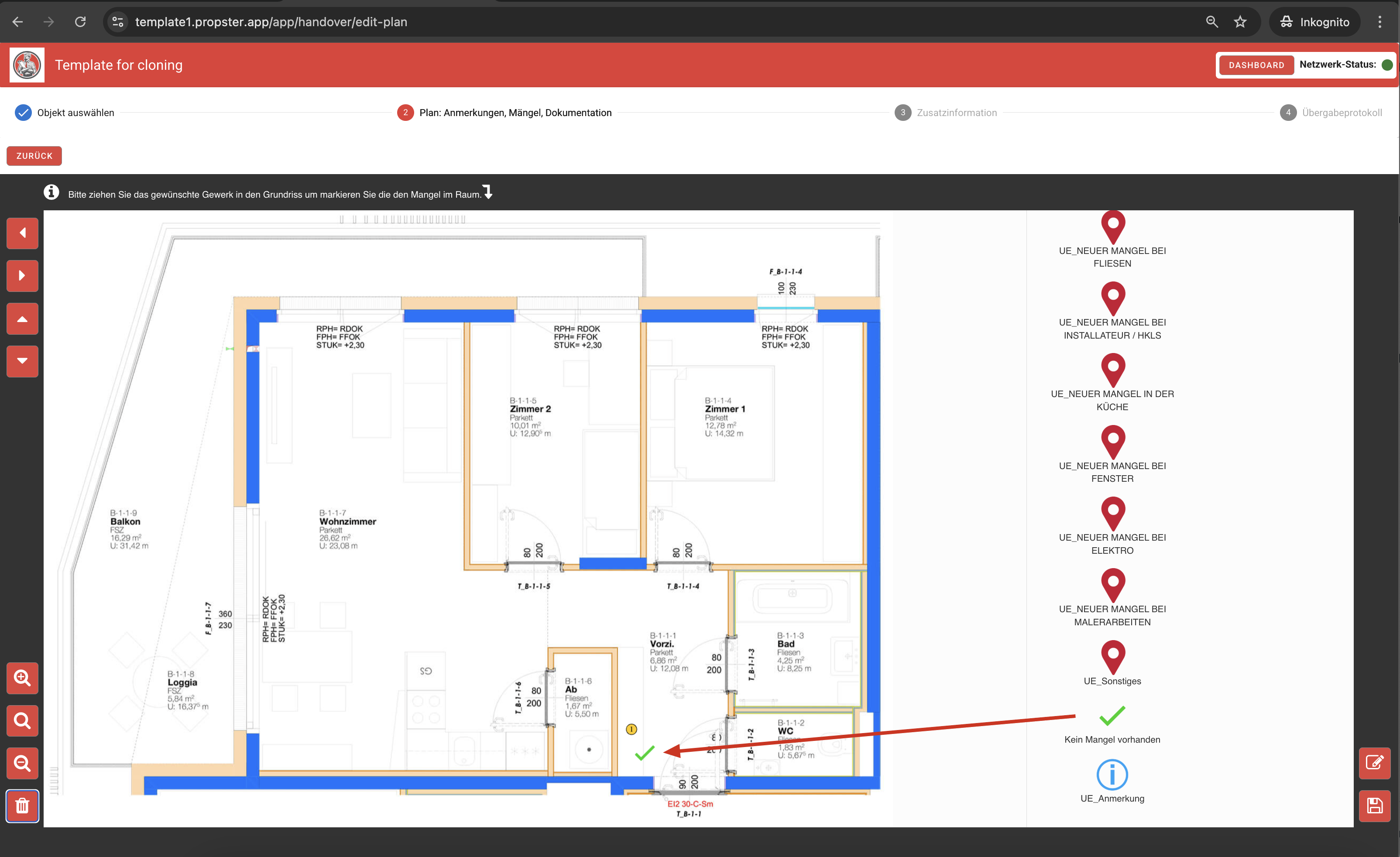 Für das Objekt ist ein Bauplan hochgeladen, auf dem Mängel verortet werden können