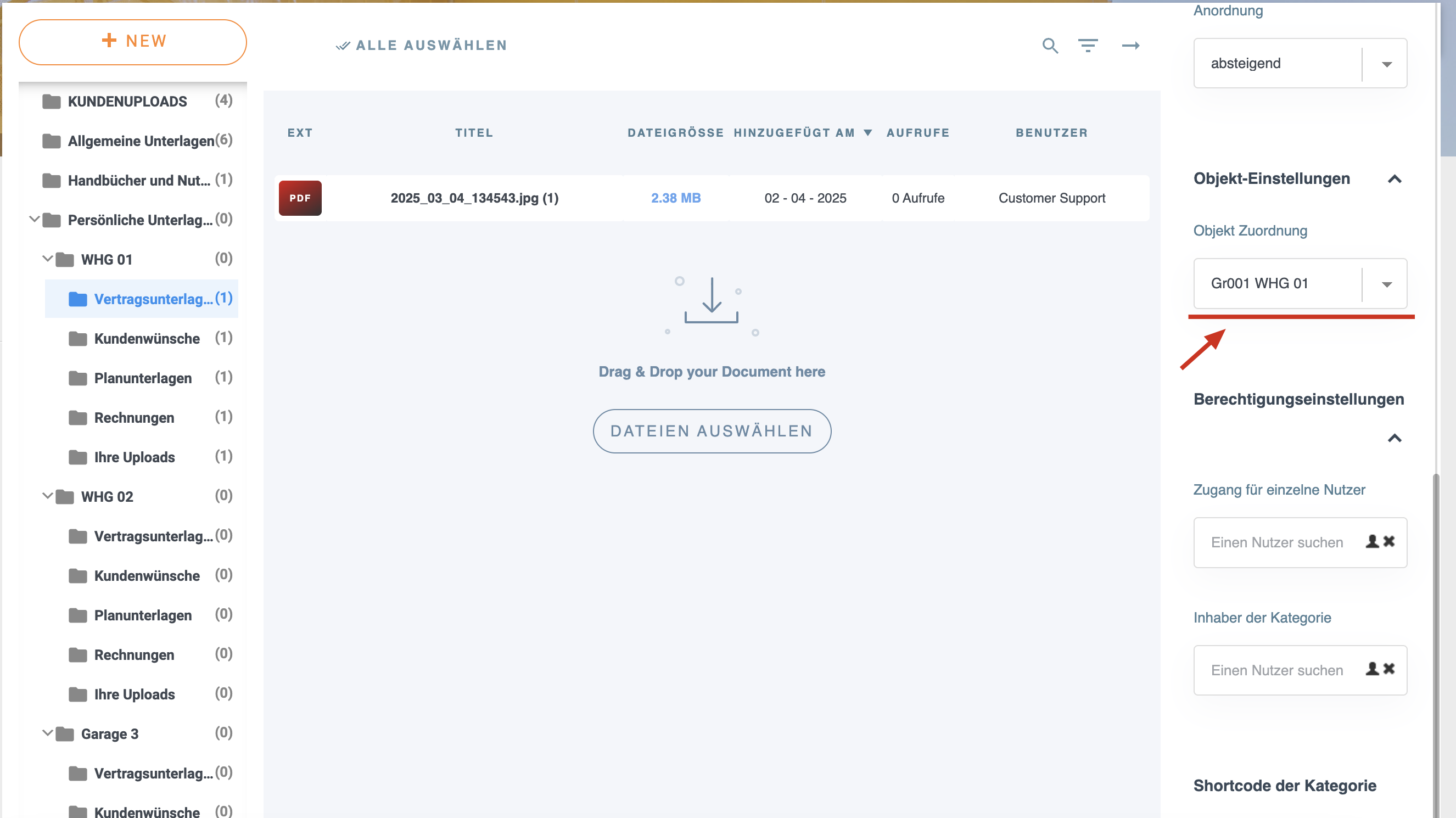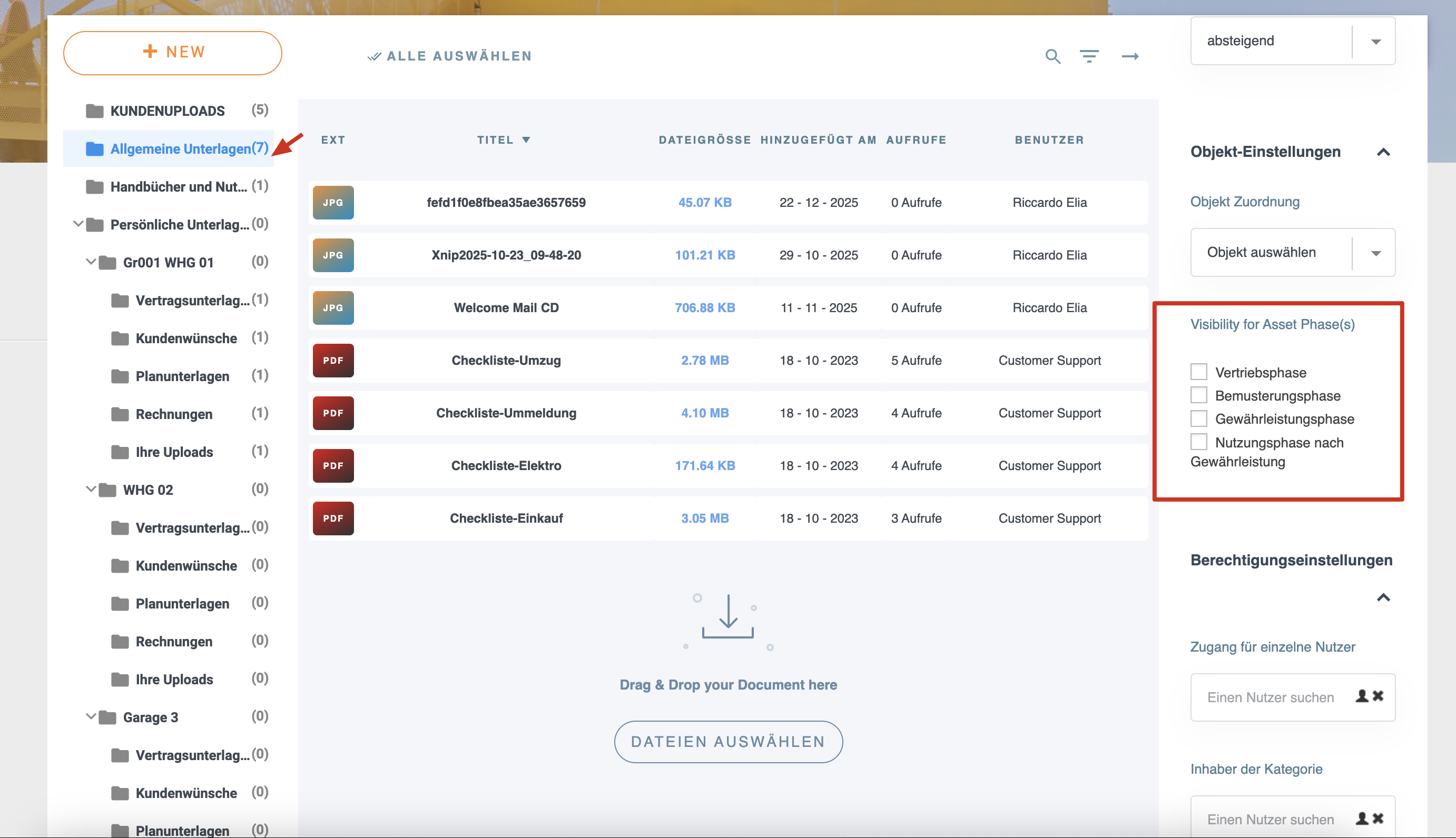 Bei persönlichen Unterlagen ist der Ordner nur für den jeweiligen Kunden sichtbar der dem entsprechenden Objekt zugewiesen ist.